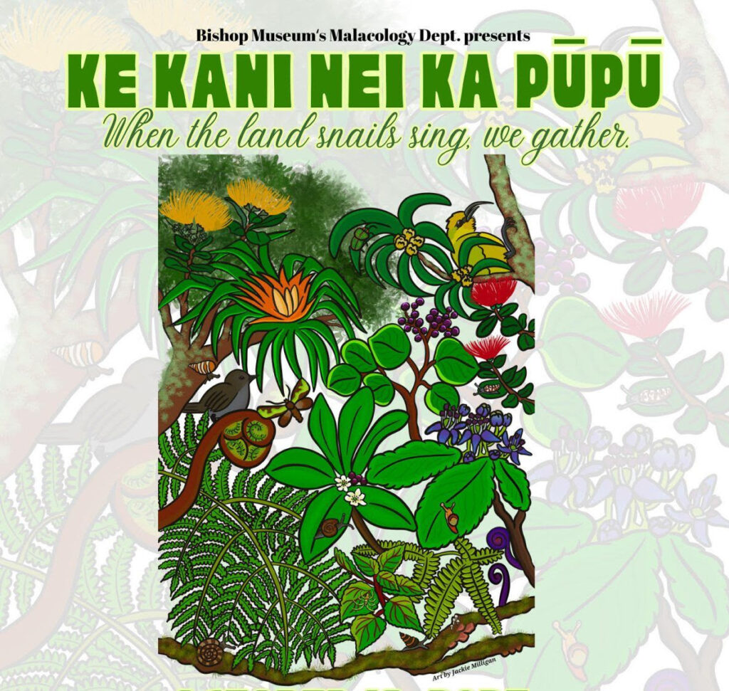 The 4th Annual Kāhuli Festival’s theme focuses on renewing and restoring cultural connections for conservation and is titled Ke Kani Nei Ka Pūpū – The Land Snails Sing. Through this theme, we acknowledge the resilience of our Hawaiian land snails in an everchanging landscape and how the aliʻi of Hawaiʻi remembered them in the naming of places, like Kamehameha III’s Nuʻuanu home, Kaniakapūpū, and in storytelling. The festival offers an opportunity for the research, conservation, education, and natural cultural resource community to showcase how we mālama pū i ka ʻāina, especially through the cultural lens surrounding endangered Hawaiian land snails and other native species.