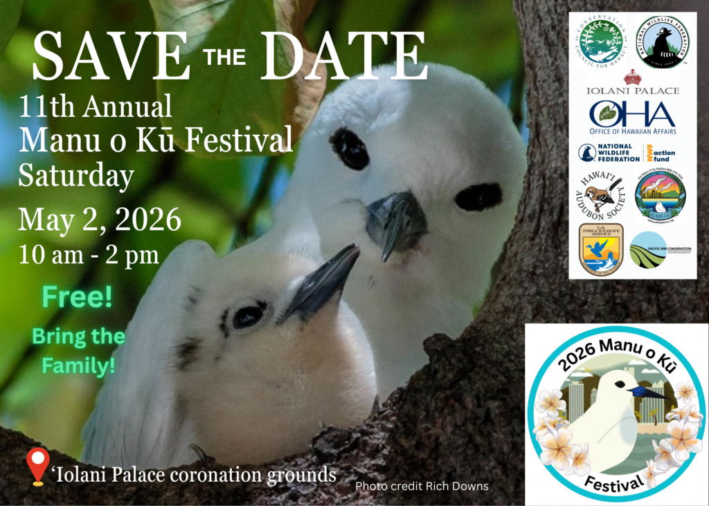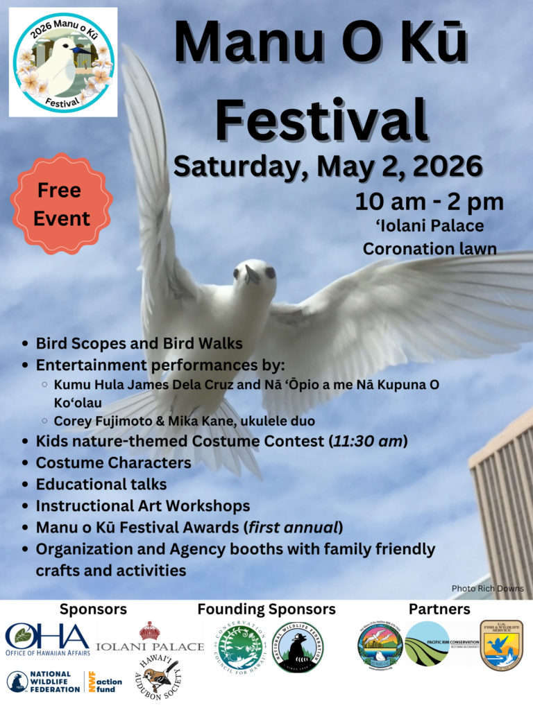 The Manu o Kū Festival is an annual event that takes place on the grounds of ‘Iolani Palace. Conservation groups, educators, and others will share games and activities that engage participants of all ages in learning about the Manu o Kū. This year’s event will take place on Saturday, May 2, 2026, and is free and open to the public.